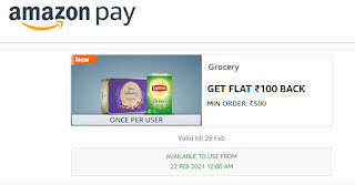 February 21, 2021 by jaybee Amazon Grocery ( Account Specific ): Flat Rs.100 Back On Min. Rs.500 Order Collect Offer : Order Now :