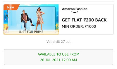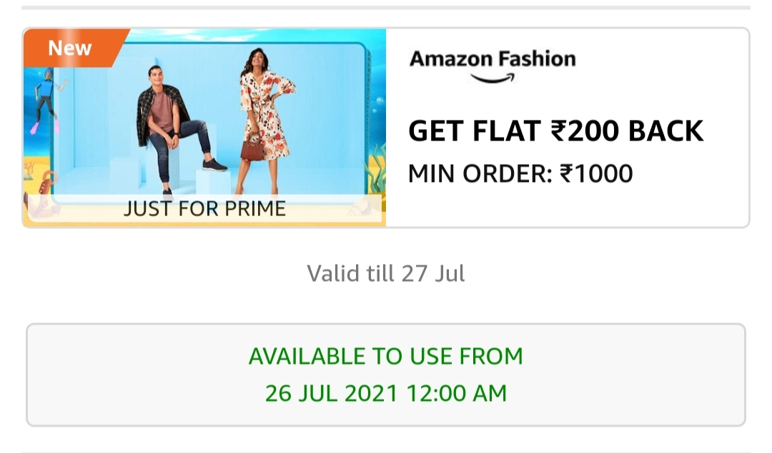 [User Specific] : Flat ₹200 cashback on minimum order of ₹1000 on Amazon Fashion (Prime Day Sale).