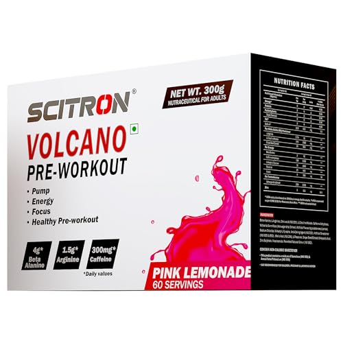 Scitron Volcano Pre Workout 300g, Pink Lemonade (60 Servings | 4g Beta Alanine | 1.5g Arginine | 300mg Caffeine | 0g Sugar | Boost Energy & Focus| Healthy Pre-workout) is available on Amazon at best discounted online price. Original price of this product is ₹ 2599. You can buy this product at discounted rate ₹ 1379.