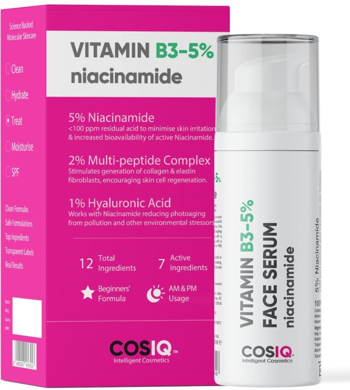 Cos-IQ Niacinamide Vitamin B3-5% High Dose Face Serum 30ml | With 1% Multi-Peptide Complex and 2% HA for Acne Marks, Blemishes, Spot Correction(30 ml) is available on flipkart at best discounted online price. Original price of this product is ₹ 499. You can buy this product at discounted rate ₹ 249.