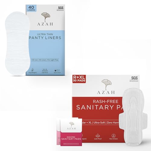 Azah Rash free Sanitary pads + Ultra soft panty liners | Sanitary combo pack for women | Pack of 20 Regular + 10 XL (with disposable bags) organic cotton pads and 40 liners | Made Safe Certified is available on Amazon at best discounted online price. Original price of this product is ₹ 649. You can buy this product at discounted rate ₹ 539.
