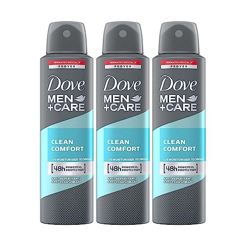 Dove Men+Care Clean Comfort Dry Spray Antiperspirant Deodorant, Up To 48 hrs Protection From Sweat & Odour, Instantly Dry for Cleaner Feel, Dermatologically Proven Formula, Soothes & Moisturises Skin, Clean, Crisp Scent, 150 ml (Pack of 3)