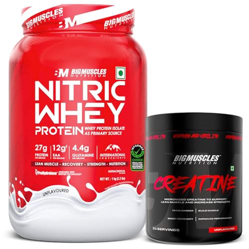 Bigmuscles Nutrition Nitric Whey Protein (1kg, Unflavoured) | 27g Isolate Protein with Creatine (100g, Unflavoured) is available on Amazon at best discounted online price. Original price of this product is ₹ 3299. You can buy this product at discounted rate ₹ 1999.