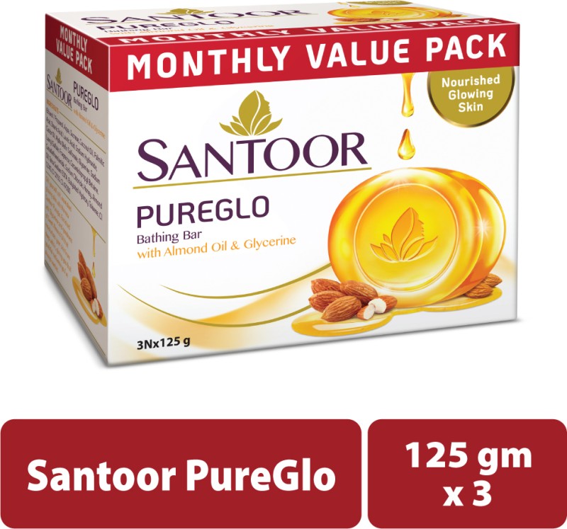 Santoor PureGlo Glycerine Bathing Bar Soap with Almond Oil for Nourished & Glowing Skin(3 x 125 g)