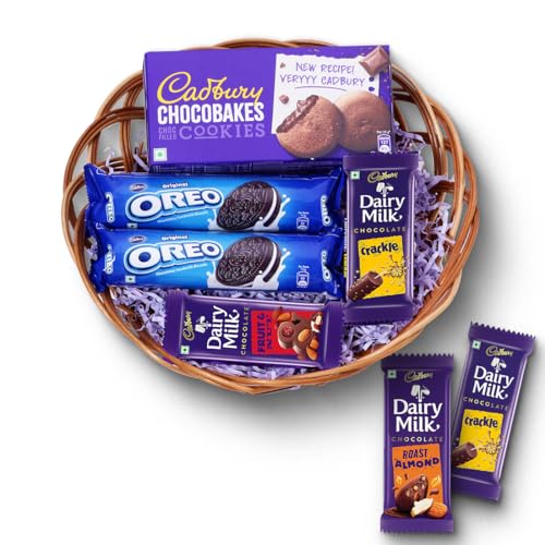 • This assorted gift basket contains 2 Units of Cadbury Dairy Milk 36 g, 2 Units of Cadbury Oreo Crème Sandwich Biscuit – 131.25 g, 2 Units of Cadbury Dairy Milk Chocolate – 52 g, 1 unit of Cadbury Chocobakes ChocFilled Cookies – 150 g, 1 unit of a special photoframe crafted by Cadbury and Rakhi. Perfect for gifting your siblings on Rakshabandhan.