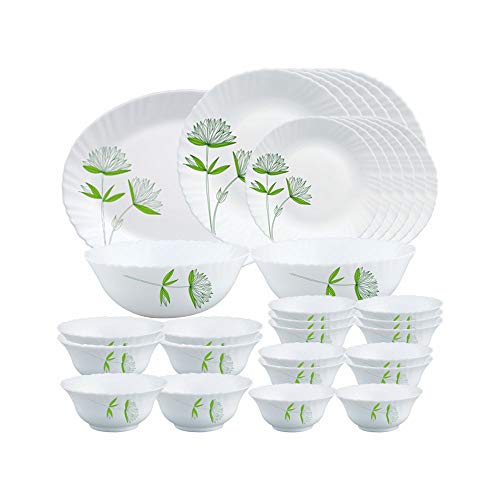 Larah by Borosil Green Lily Opalware Dinner Set, 33-Pieces, White
