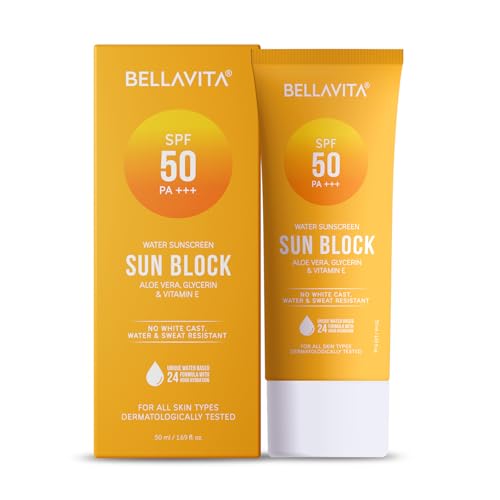 BELLAVITA Water based Hydrating Sunscreen, SPF 50, Lightweight, Photostable, PA+++, For All Skin Types, No White Cast, Non – Greasy Finish, UV Protection, Broad Spectrum, For Men & Women, 50ML is available on Amazon at best discounted online price. Original price of this product is ₹ 399. You can buy this product at discounted rate ₹ 149.
