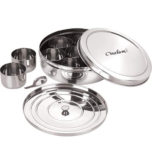 - Package Contents: 1 Masala Dabba with Lid + 7 Containers + 1 Spoon and 1 Steel Plate. Item Dimensions LxWxH : 19 x 19 x 6.0 Centimeters. Capacity : 1225 ML