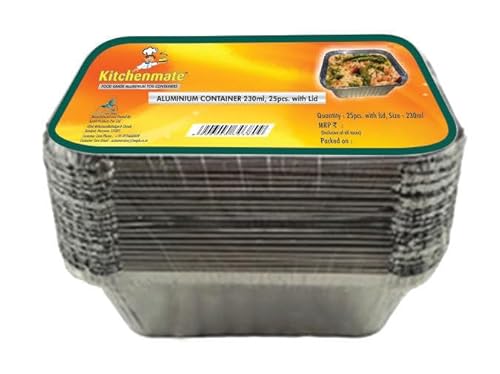 Kitchenmate 25 pcs Extra Strong Aluminium Silver Foil Container 230 ml, Food Storage Disposable Containers with Lid for Kitchen is available on Amazon at best discounted online price. Original price of this product is ₹ 399. You can buy this product at discounted rate ₹ 73.